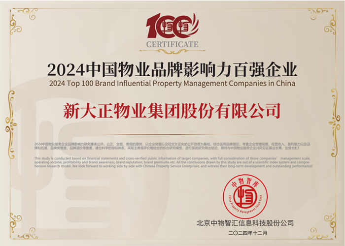 2024中國物業(yè)品牌影響力百強(qiáng)企業(yè)證書