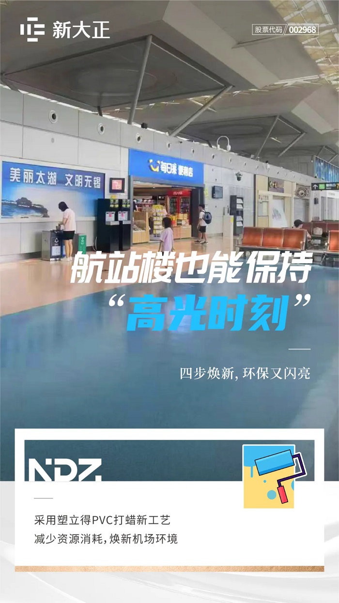 新大正針對無錫機(jī)場航站樓等服務(wù)項(xiàng)目PVC地面特點(diǎn),創(chuàng)新采用塑立得PVC打蠟新工藝,將原有七步打蠟流程精簡為四步,大幅降低用水量,減少資源消耗與環(huán)境污染。新工藝不僅有效提升了地面光澤度與硬度,更為旅客帶來了全新的視覺與感官體驗(yàn)。
