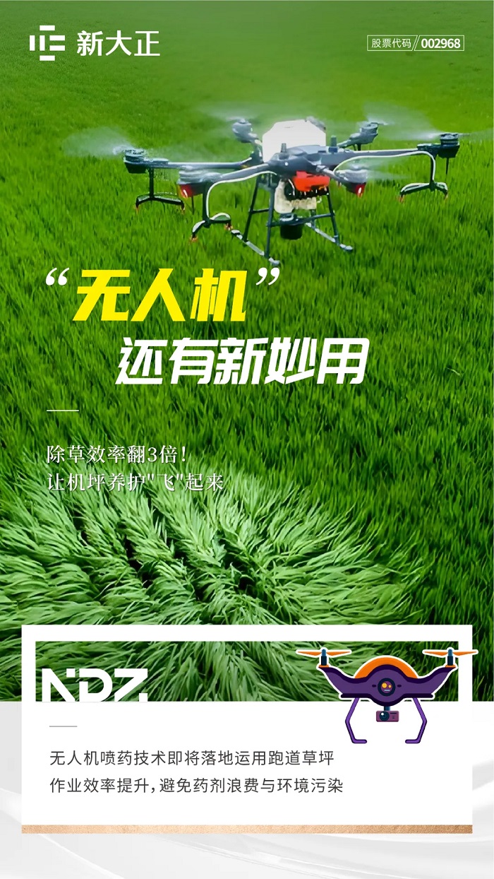 相對于傳統(tǒng)人工除草效率低,新大正引入無人機(jī)噴藥技術(shù),精準(zhǔn)覆蓋跑道邊緣與狹小區(qū)域,效率提升3倍,同時(shí)避免藥劑浪費(fèi)與環(huán)境污染。