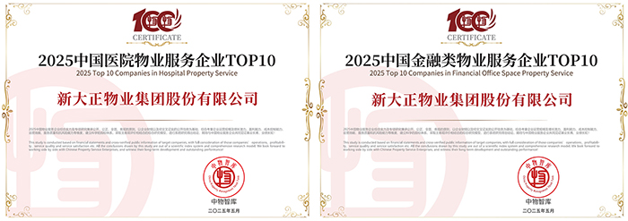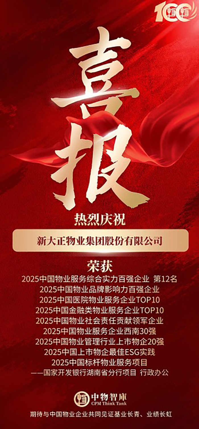 會上,發(fā)布《2025中國物業(yè)百強(qiáng)企業(yè)研究報(bào)告》,同期重磅發(fā)布“2025中國物業(yè)服務(wù)綜合實(shí)力百強(qiáng)企業(yè)”、“2025中國物業(yè)品牌影響力百強(qiáng)企業(yè)”及系列專項(xiàng)榜單。新大正憑借卓越的綜合實(shí)力、創(chuàng)新服務(wù)模式及社會責(zé)任擔(dān)當(dāng),一舉斬獲“2025中國物業(yè)服務(wù)綜合實(shí)力百強(qiáng)企業(yè)第12名”、“2025中國物業(yè)品牌影響力百強(qiáng)企業(yè)”、“2025中國醫(yī)院物業(yè)服務(wù)企業(yè)TOP10”、“2025中國金融類物業(yè)服務(wù)企業(yè)TOP10”、“2025中國物業(yè)服務(wù)企業(yè)西南30強(qiáng)”、“2025中國物業(yè)管理行業(yè)上市物企20強(qiáng)”、“2025中國標(biāo)桿物業(yè)服務(wù)項(xiàng)目―國家開發(fā)銀行湖南省分行項(xiàng)目(行政辦公)”等九項(xiàng)殊榮。其中,新大正首次斬獲“2025中國物業(yè)社會責(zé)任貢獻(xiàn)領(lǐng)軍企業(yè)”、“2025年中國上市物企最佳ESG實(shí)踐”榮譽(yù)稱號,彰顯了行業(yè)對新大正社會責(zé)任價(jià)值的高度認(rèn)可。