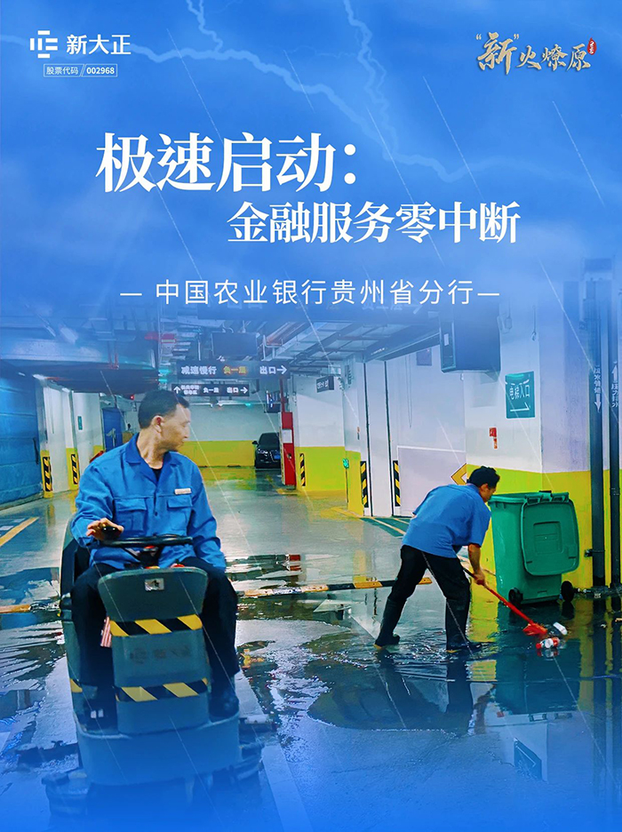 6月25日,貴陽市暴雨橙色預警(II 級)發(fā)布后,中國農業(yè)銀行貴州省分行項目團隊立即啟動防汛機制。新大正全員行動,項目經理駐守統(tǒng)籌:全渠道發(fā)布預警;秩序排查加固門窗;工程疏通排水管網。各部門協(xié)同精準防控,成功守護資產安全,確保暴雨期間業(yè)務零中斷。