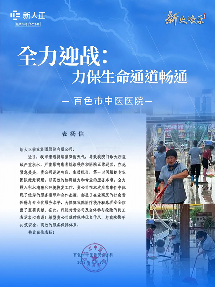 6月22日凌晨,百色市右江區(qū)暴雨導致中醫(yī)院門診樓污水倒灌,多區(qū)域嚴重積水。百色市中醫(yī)醫(yī)院項目經理火速啟動預案,現(xiàn)場指揮:應急小組嚴防死守電梯、放射科等核心設備;保潔全員奮戰(zhàn),清掃積水并進行專業(yè)消殺除味。團隊高效響應,保障生命通道暢通、診療秩序恢復,獲得院方感謝與肯定。
