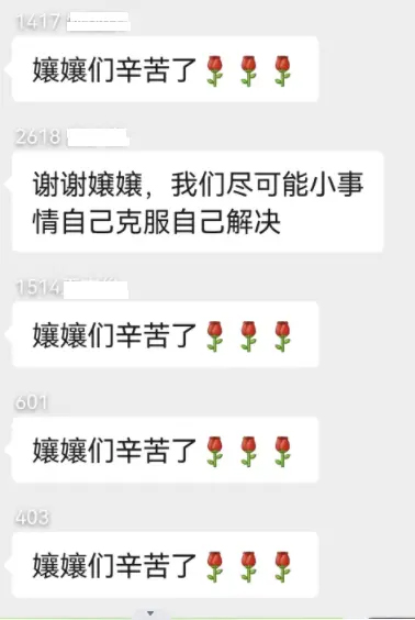但是學(xué)生們懂得這份不容易,他們在微信群里紛紛發(fā)起,“嬢嬢們辛苦了!”每個(gè)人還得跟上三朵“小紅花”,似乎要親手把它別在嬢嬢們的衣服上。