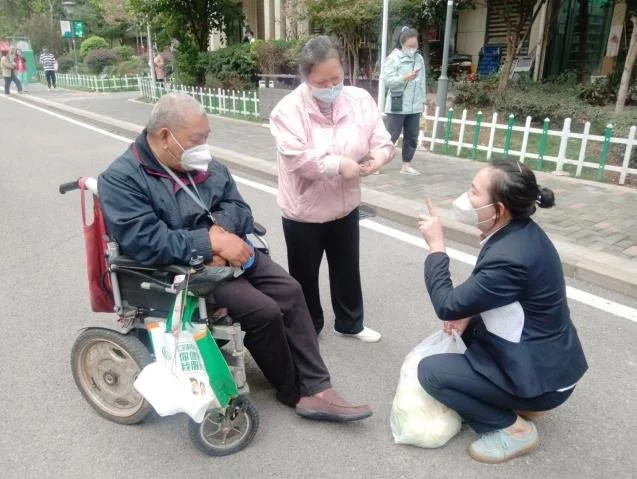 在西南政法大學(xué)周邊街道,由新大正物業(yè)西政項(xiàng)目員工和社區(qū)共同組成的“紅巖服務(wù)隊(duì)”,為1000多戶居民清運(yùn)垃圾、配送物資。80多歲的劉婆婆行動(dòng)不便,他們就開著電瓶車給她送米、送菜、送油、上門做核酸。