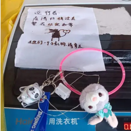 旁邊躺著一只冰墩墩和星黛露,原來是送給物業(yè)人員的小禮物。