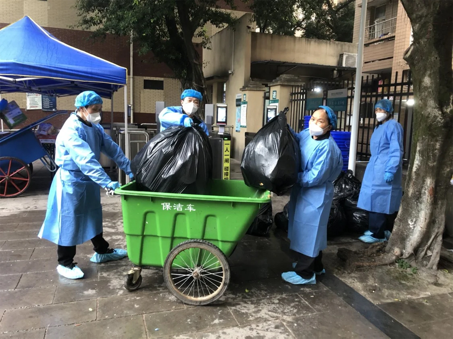 在重慶郵電大學(xué)等高校里,物業(yè)人員和學(xué)校組成送餐隊(duì)伍,每天把幾十上百箱飯菜送到學(xué)校宿舍區(qū)。送完餐之后再收拾餐盒垃圾,往返十幾趟是常態(tài),厚重的防護(hù)服里全是汗水。