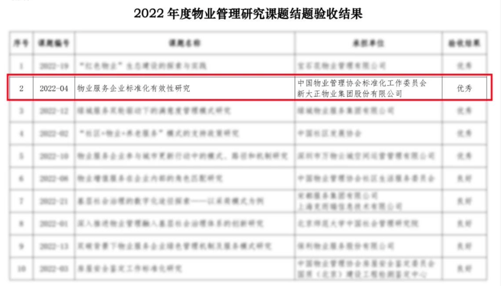 近日,由新大正物業(yè)集團(tuán)(以下簡稱“新大正)承擔(dān)的中國物業(yè)管理協(xié)會2022 年度課題《物業(yè)服務(wù)企業(yè)標(biāo)準(zhǔn)化有效性研究》順利通過結(jié)題驗(yàn)收,并從眾多課題中脫穎而出,榮獲2022年度物業(yè)管理“優(yōu)秀”研究課題,也是此次五個優(yōu)秀課題之一。